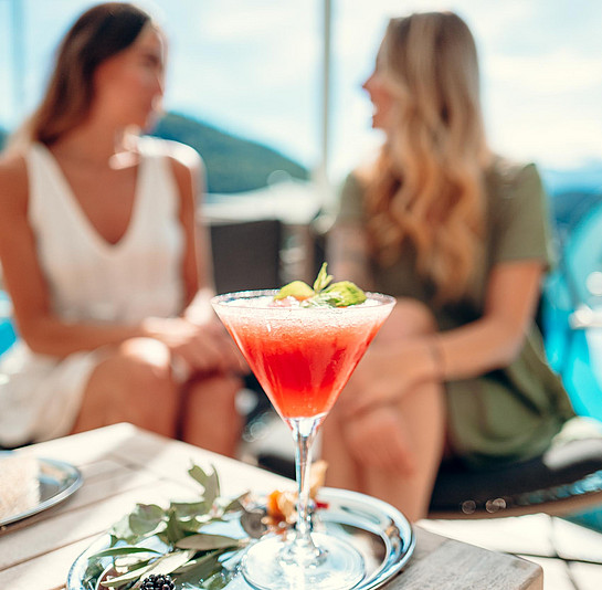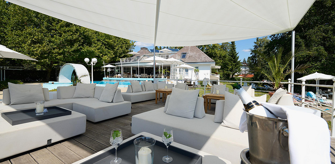 Vor allem bei Sonnenuntergang bietet die Lounge direkt über dem Bootshaus einen tollen Ausblick über den See zu den Bergen. Abends verwandelt sich das Strandcafé in eine erfrischend-ausgelassene Strandbar mit erstklassigen Cocktails und stimmungsvoller Musik. Danach ist auch der Spaziergang über den Strand und die Stege bei beleuchtetem Wasser ein wildromantisches Rendezvous mit der sternenbedeckten Nacht.