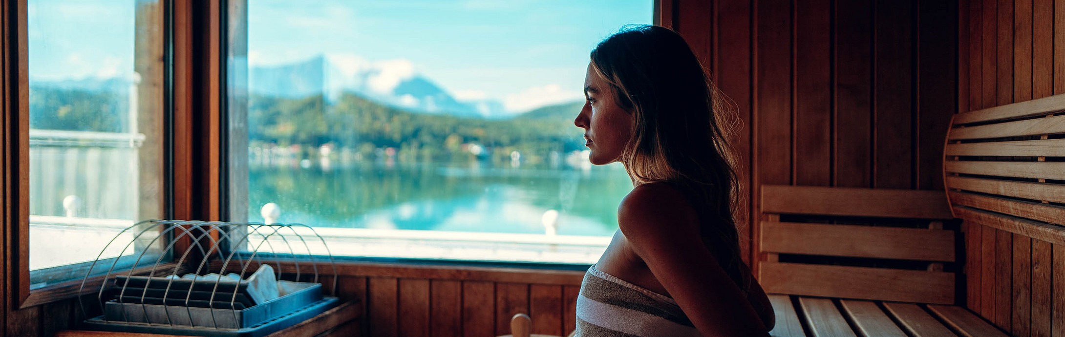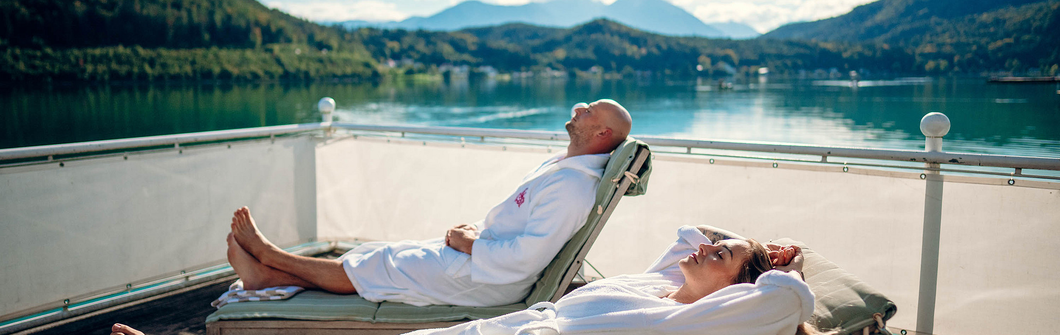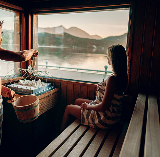 Saunieren Sie direkt über dem See, zelebrieren Sie erlesene Aufgüsse und lassen Sie sich wie Adam und Eva vom Wasser umarmen. Abkühlend frisch. Charmant und mild. Ideal für vor und nach der Sauna. Für die nahtlose Bräune steht Ihnen bei Ihrer persönlichen Seenwellness-Zeit in Kärnten der abgegrenzte Sauna-Vorbereich als Ruhezone zur Verfügung.