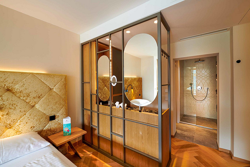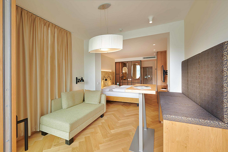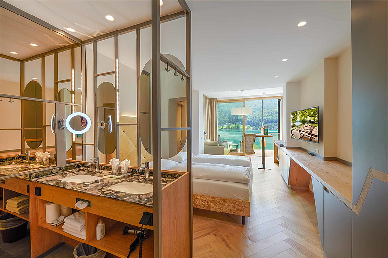 Stilvoll-eingerichtetes großes Doppelzimmer mit Glasbalkon und Blick auf den See