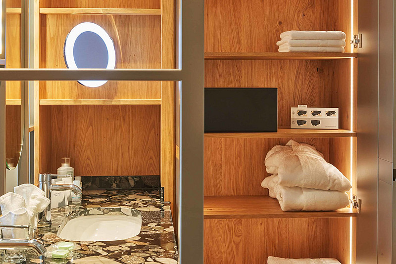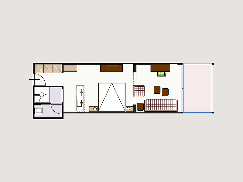 Wohn-Schlafraum mit Parkettboden, offenes Badezimmer mit Dusche, seperates WC, Lage im Stammhausteil, Panoramabalkon mit Seeblick nach Süden.