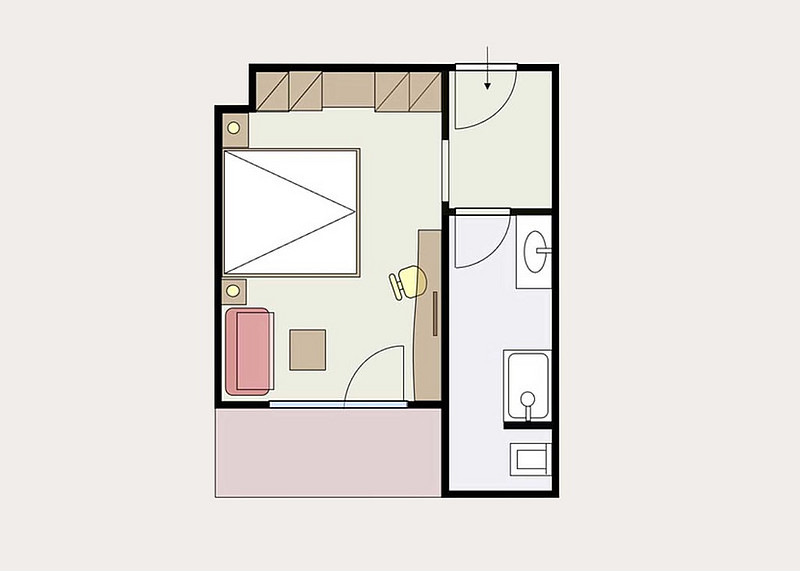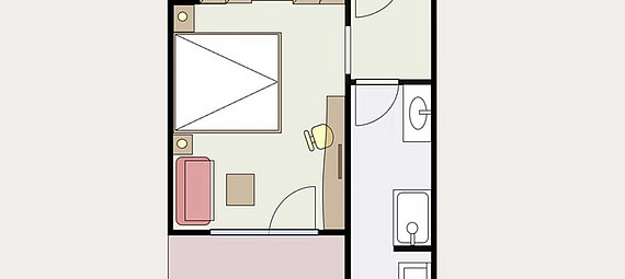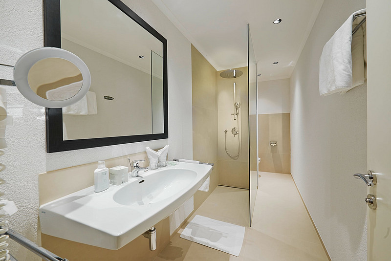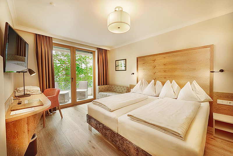 Doppelzimmer mit Parkettboden, Badezimmer mit Dusche und WC, Lage im Hausteil “West-End”, Balkon zur Westseite (kein bzw. eingeschränkter Seeblick).
