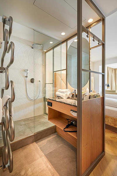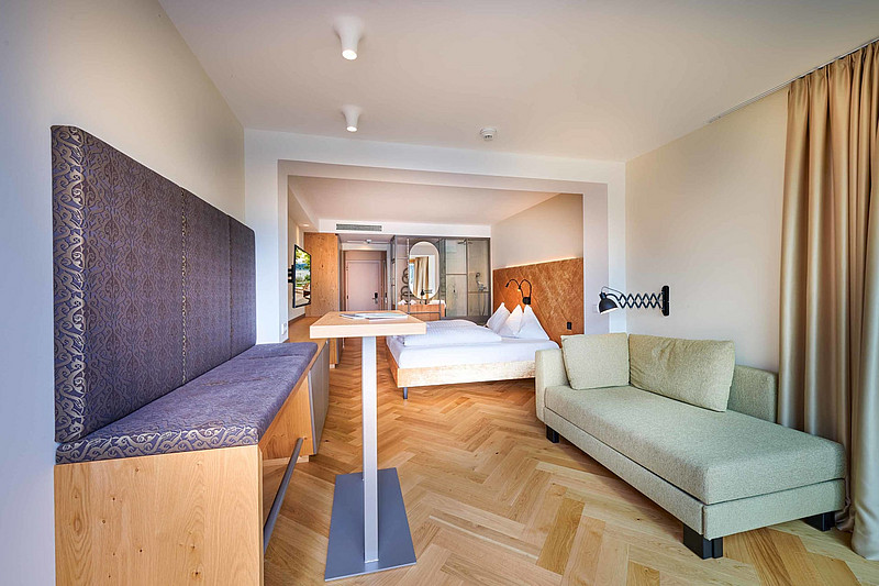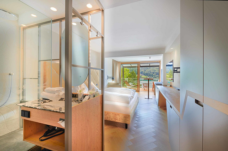 Stilvoll-eingerichtete Juniorsuite mit Glasbalkon und traumhaften Blick auf den See