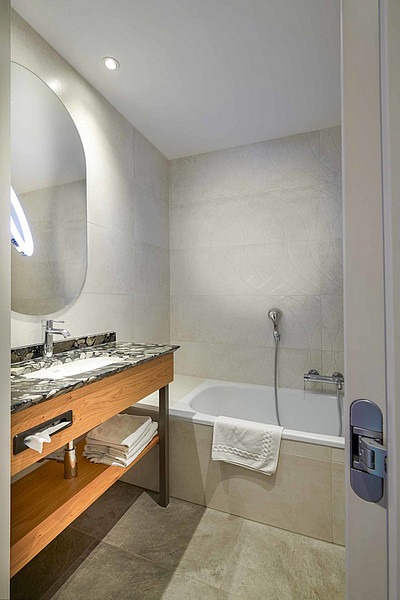 Doppelbett, Badezimmer mit WC und Badewanne, freistehender Doppel-Waschtisch, Glasdusche, Lage im Hausteil 'Stammhaus', Balkon mit Seeblick nach Süden.